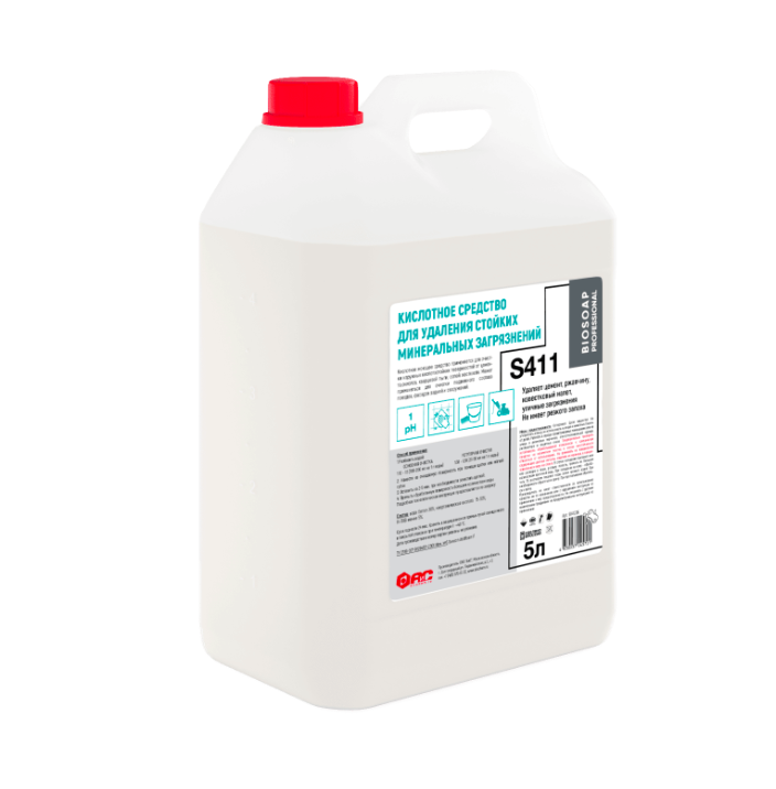 Кислотное моющее средство (концентрат) BIOSOAP PROFESSIONAL, S411, 5л. (упак.4шт), применяется для очистки наружных кислотостойких поверхностей от цемента,окислов, кварцевой пыли, солей жесткости. Может применяться для очистки подвижного состава поездов, фасадов задний и сооружений.