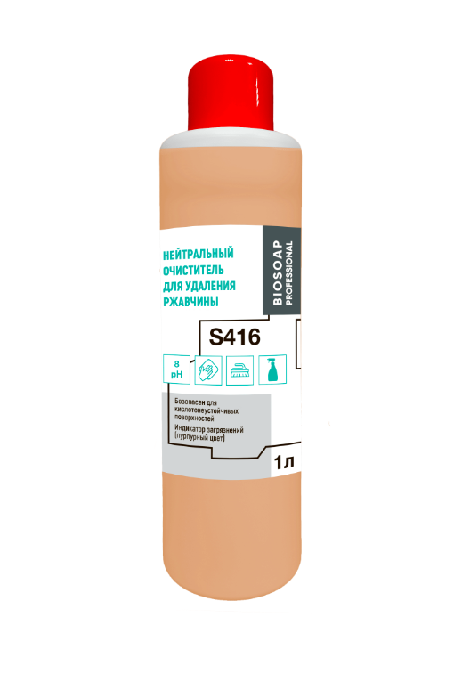Нейтральный очиститель для удаления ржавчины BIOSOAP PROFESSIONAL, S416, 1л. (упак.12шт). При контакте с загрязнением окрашивается в пурпурный цвет. Для деликатного удаления ржавчины с алюминия, хрома, меди, латуни, мрамора и прочих поверхностей. Не вызывает коррозии металлов.